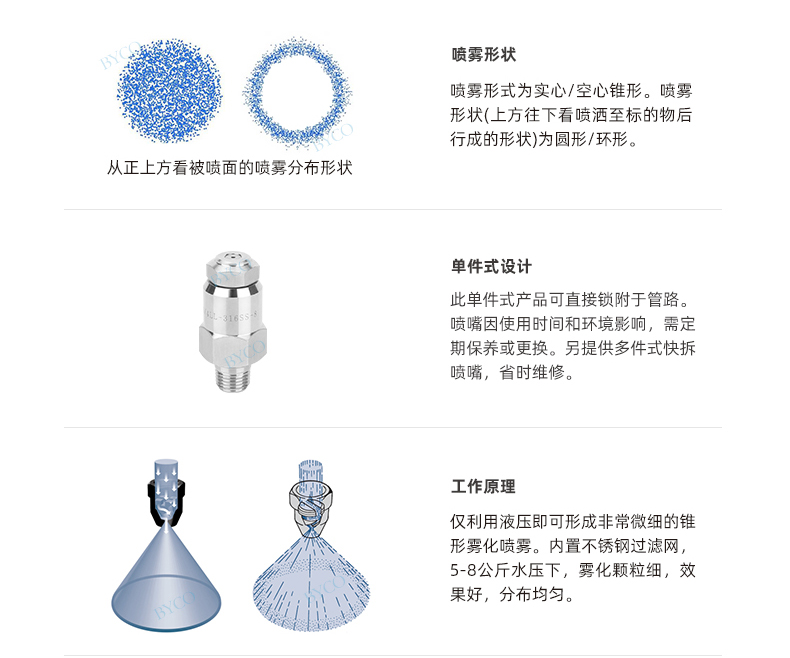 液滴大小為非常細(xì)小,形成霧狀噴霧效果。壓力和流量適用范圍廣。