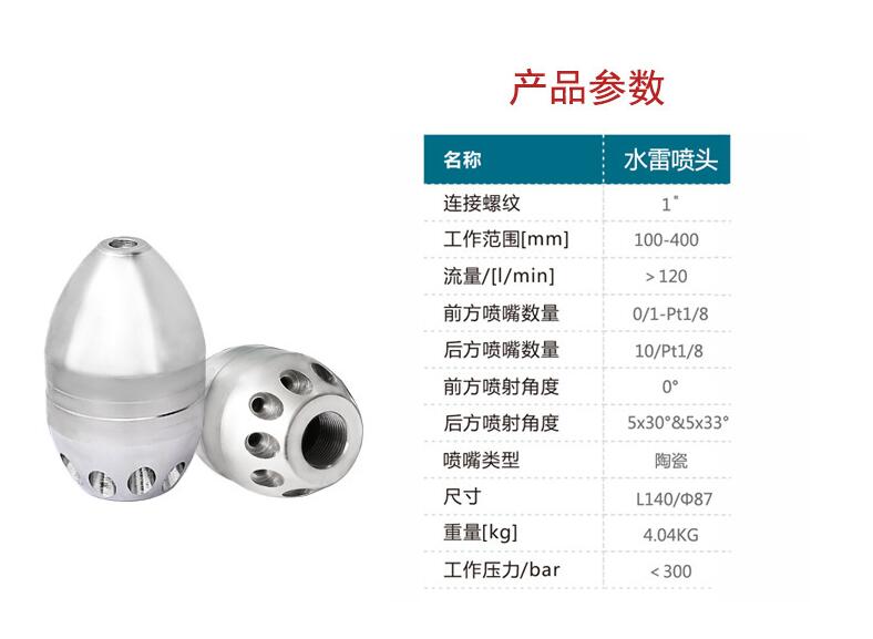 螺紋接口:1寸內(nèi)牙,或者訂做噴嘴接口尺寸,重量10.3KG,適用管徑:300-1200MM,主要適用于清洗管道中及管底的沉淀物(如:沙子 碎石 污垢等,) 適用于噴頭需要強(qiáng)大的推進(jìn)力的管道,噴頭材質(zhì)為特種不銹鋼材質(zhì),噴嘴可更換。